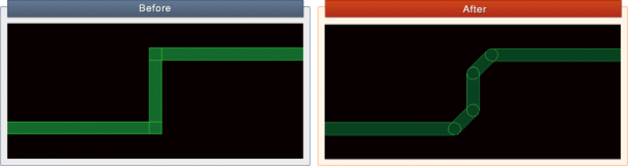 直角配線の場合、特性インピーダンスが局所的に変化し、