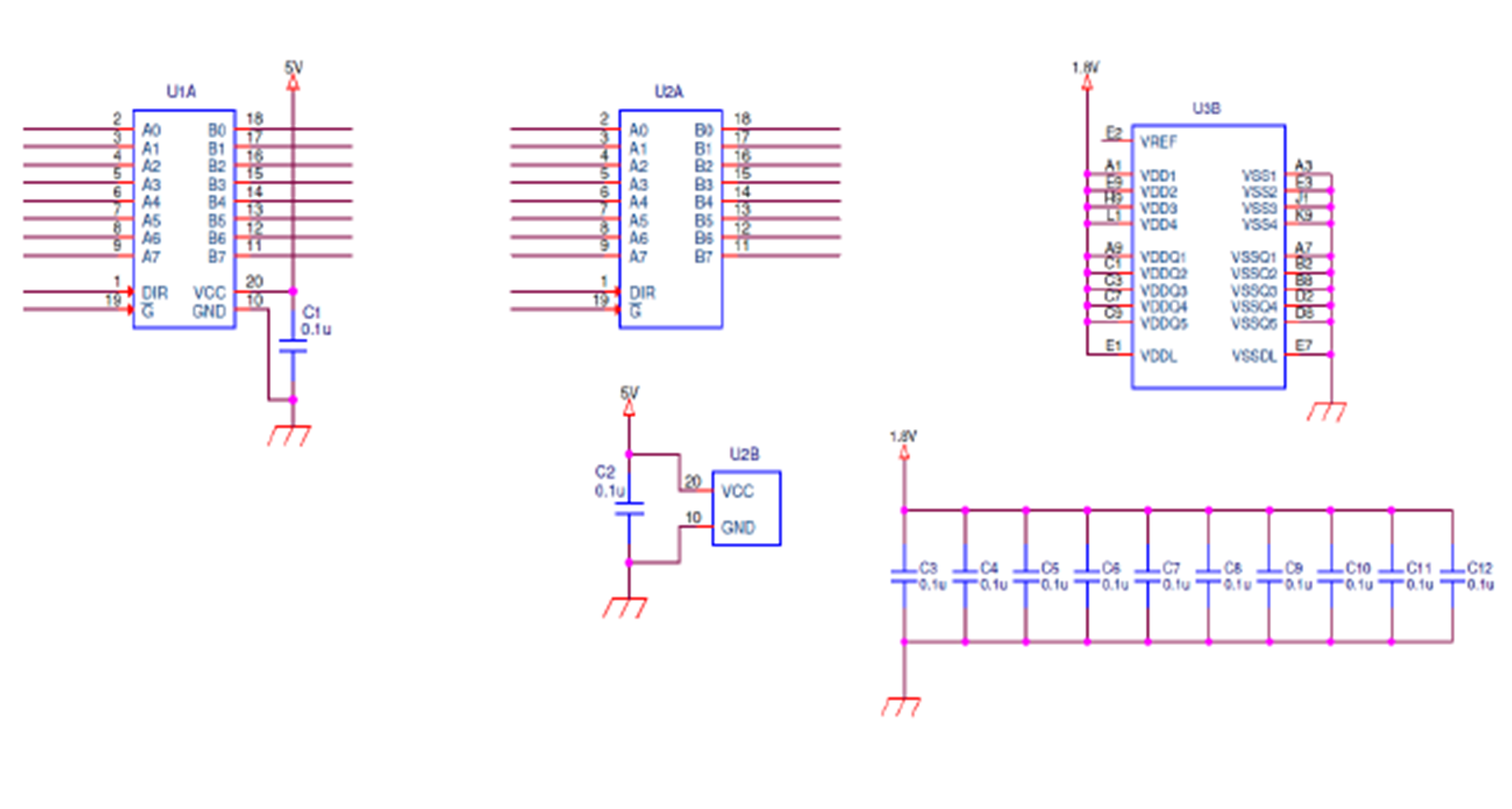 また同様に、回路図で複数のIC用のコンデンサがまとめて書いてある場合に、